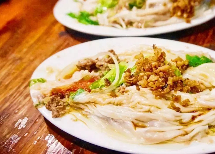 普宁粉皮白如雪花、薄如蝉翼、晶莹剔透,吃起来鲜香满口、细腻爽滑,还有一点点韧劲。晶莹剔透的粿卷拌有零碎新鲜的肉沫,再浇上精心调制过的酱汁,实在是人间美味。