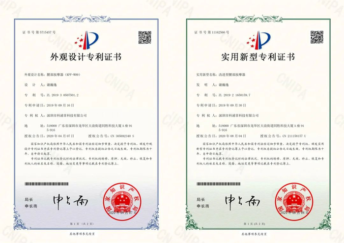 科普菲腰部按摩器首先就把两个专利握在了手里。