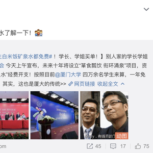 17日,厦门大学深圳校友会宣布,2021年到2030年的十年间将为母校所有在校生的米饭和矿泉水买单!