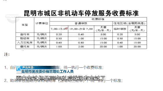 昆明市发改委价格管理处工作人员:“电动车停放收费标准,现在没有在定价目录里面,原来定过,2016年以后就没有定过了,定价目录里面政府就不定价了,电动车保管站收费标准,是需要公示的,就是要把公示贴出来,几个小时多少钱,这个是必须要公示的。”