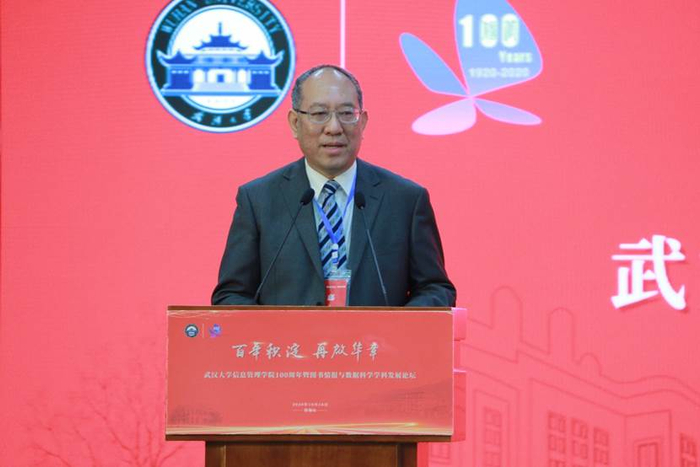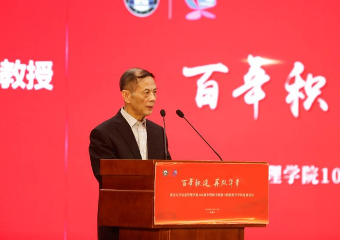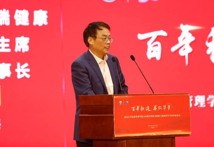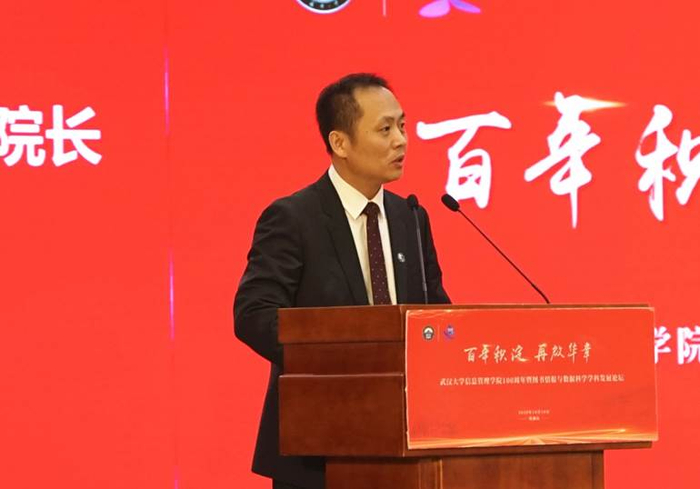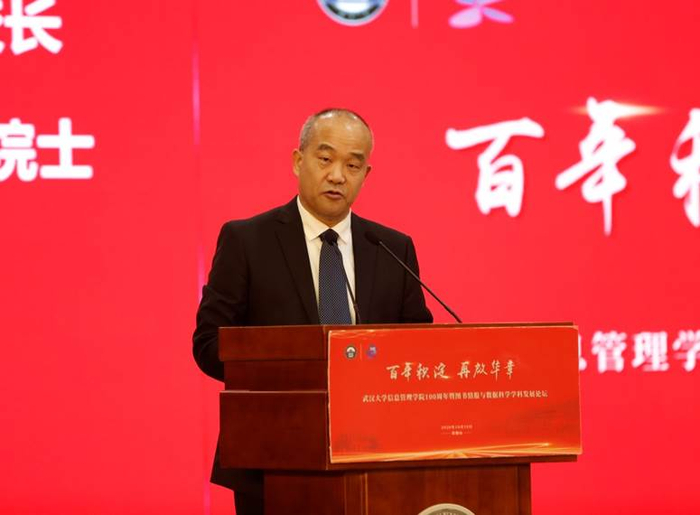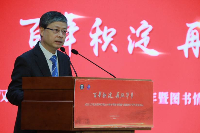 窦贤康致辞,对信息管理学院百年来取得的成就表示热烈祝贺。他指出,信息管理学院是武汉大学人文社科的一张靓丽名片,百年来,学院敢为人先、追求卓越,励精图治、奋发有为,大师云集、群英荟萃,桃李满园、英才辈出,几代学人薪火相传,谱写了中国图书情报档案学与信息管理教育史上如诗如画的壮丽篇章;始终把握时代发展脉搏,为国家信息化发展和文化强国战略做出了突出贡献。他希望,信息管理学院能够抢抓重大历史机遇,守正出新、继往开来,在保持传统学科优势的基础上,扎根中国大地,抢抓发展机遇,创新学科范式与人才培养模式,促进学科新发展;秉持经世致用理念,践行“四个服务”,不断增强服务国家重大战略需求的能力,为国家和社会发展做出新的更大贡献;牢牢把握人才关键要素,加大高端人才和中青年拔尖创新人才的引育力度,打造更加强大的“信管人才方阵”,以人才促进教学科研提质量、学科建设上水平、人才培养见实效,推动学院高质量发展。