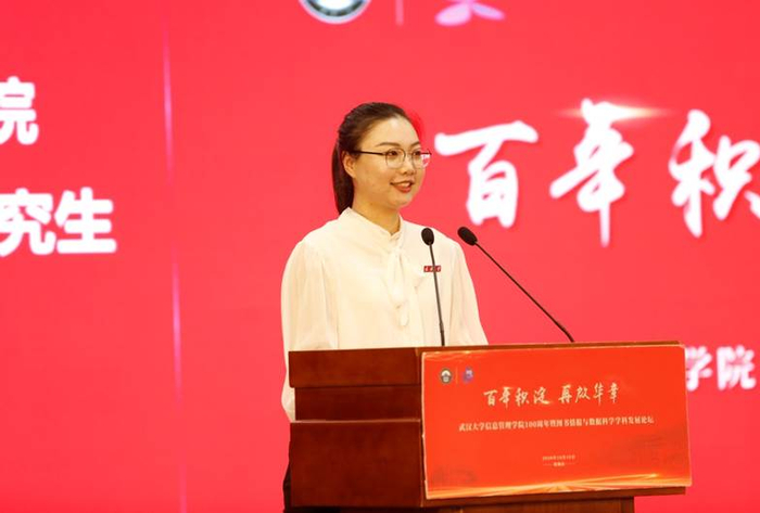 2020级博士研究生李沐妍作为在校生代表发言。她讲述了自己在学院七年的成长过程,表达了对学院的热爱和对老师们精心培养的感恩,表示信管学子要明确自己的角色定位和责任担当,为公众生活智慧服务,为行业产业提供支撑,为社会发展传递知识,为民族文化坚定守护,为国家建设记录历史,为人类进步管理信息。