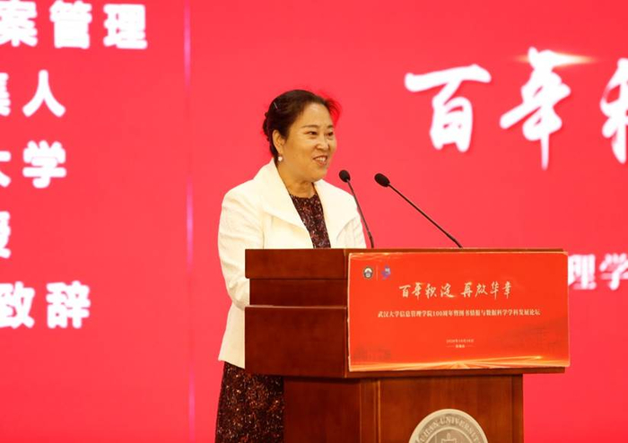 北京大学信息管理系主任张久珍作为兄弟院系代表致辞。她高度肯定了武汉大学信息管理学院在各个方面取得的成就,认为学院引领和推进了我国图书情报事业的发展。她提出,要铭记老一辈学者的历史贡献,共同推动信息管理学科与其他学科的融合发展。她希望加强两校交流合作,促进共赢,为国家图书情报事业做出更大贡献。