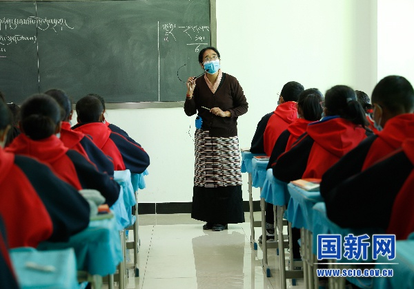 藏文老师卓嘎为初三八班的同学们上课。