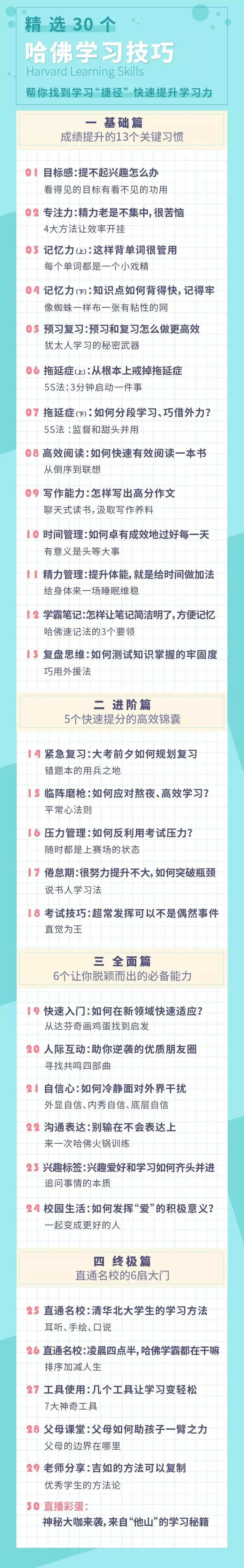 我精心挑选了实用的干货,打磨成30堂课,覆盖从基础到终极4大学习力升级阶段,让你掌握清华、哈佛等世界级名校的高效学习方法。
