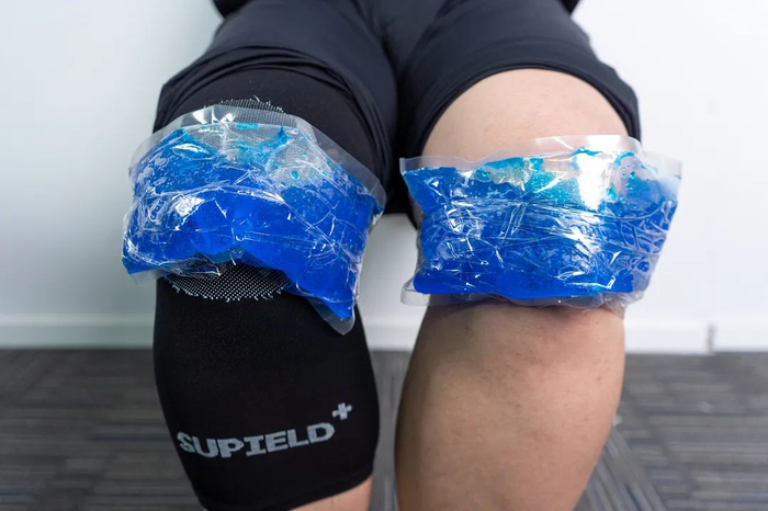 3、为了模拟寒冷环境,我们把冰袋绑在膝盖上,进行寒冷条件下的测试。(一般情况下由于有裤子包裹,人体基本上不会直接接触零下温度的冷空气)