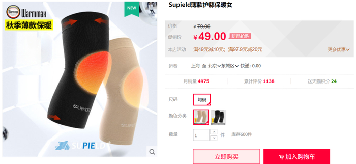 现在微信页面购买,享受立减10元的优惠,现在想要拥有一双素湃岩浆岩护膝只要39元!