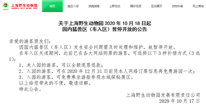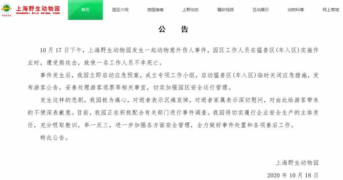据上海野生动物园10月18日公告,10月17日下午,上海野生动物园发生一起动物意外伤人事件,园区工作人员在猛兽区(车入区)实施作业时,遭受熊攻击,致使一名工作人员不幸死亡。
