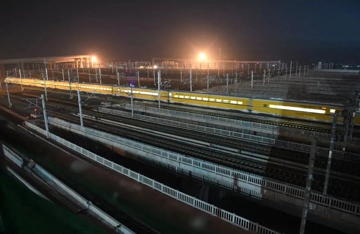 郑州南站位于郑州市航空港区,是郑州市第三个铁路大型综合客运枢纽站之一,与郑州站、郑州东站形成“金三角”的枢纽格局,串联起河南“米”字形快速铁路网和中原城市群城际铁路网,郑州南站集高铁客运中心、高铁物流中心、空铁换乘中心、长途客运中心和旅游集散中心于一体。郑州南站建筑面积为48.3万平方米,设计16座站台、32条到发线,其中城际场设7座站台、13条到发线,目前工程正在建设中,本次进行联调联试的是郑州南站24至27道。
