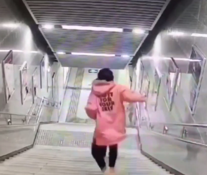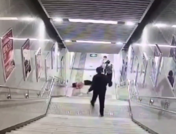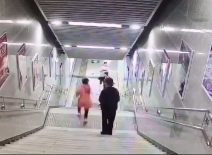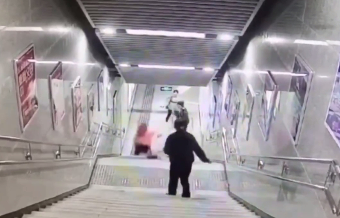 好疼!女子玩手机踩空,滚下地铁站楼梯