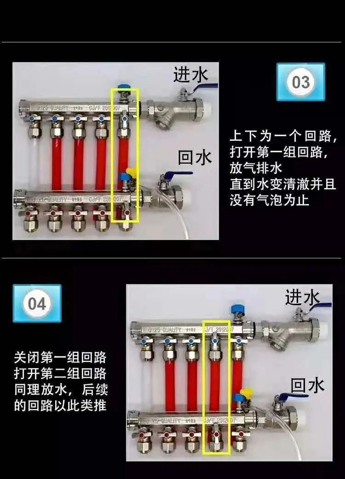 第三步:上下为一个回路,打开第一组回路,放气排水,直到水变清澈并且没有气泡为止。