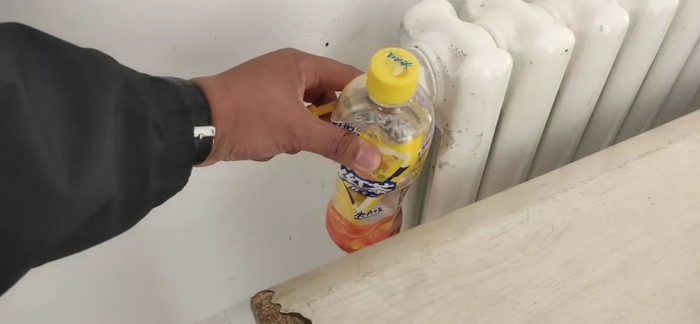2、把矿泉水瓶口对准暖气阀门,然后螺丝刀从瓶身穿过去查到阀门的位置;