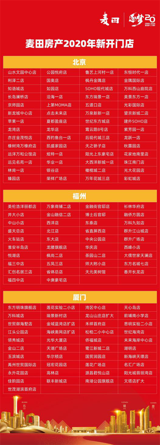 当时代都在求新、求速,二十岁的麦田仿佛行业中的一个特立独行的存在。二十年前麦田初创时,那些不为人所理解的理念,如同一颗种子,在二十年里渐渐长成一片丰茂麦田。今年,这片麦田生长尤其迅猛。近日,麦田房产再次扩增100家新门店,在北京、福州、厦门三地同时开业,献礼二十周年司庆。