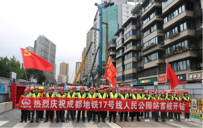 人民公园站结构形式为地下四层双柱三跨岛式站台车站。项目地处成都市人民公园,为城市中心区域,沿线地面交通流量大,交通组织难度大;区域内涉及地下管线繁多,工程实施难度大。成都轨道建设积极与交管局、街道办、城管等各产权单位沟通协调,同时推动了小南街单行道方案的实施,为首桩开钻创造了有利条件。