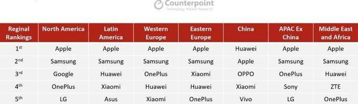 成果逐渐显现了出来。据权威调研机构Counterpoint统计,2020年第一季度的全球主要市场高端手机品牌TOP5中,国产品牌的身影开始频繁出现。而在北美、西欧、亚太这类高势能市场中,还有一家年轻的智能手机品牌一加手机(OnePlus),悄然间站稳了位置。