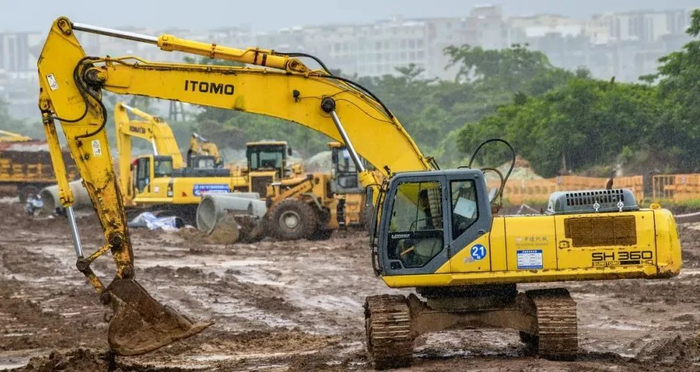 虽然面临连续降雨天气,临空二期配套路网项目施工依旧热火朝天。 海口日报记者 陈长宇 摄