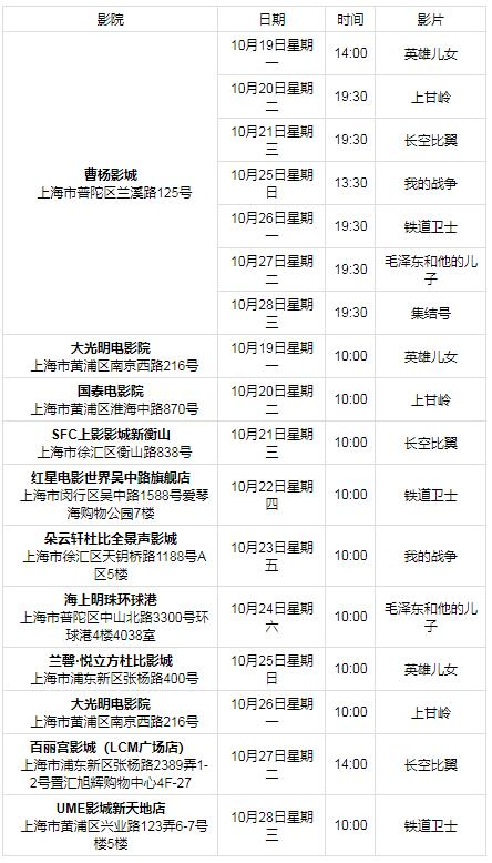 在纪念中国人民志愿军抗美援朝出国作战70周年之际,上海电影放映行业协会将于10月19日至28日举行主题影展,展映影片包括《我的战争》《毛泽东和他的儿子》《英雄儿女》《上甘岭》《长空比翼》《铁道卫士》《集结号》。影展将在10家影院进行展映,分别为:曹杨影城、大光明电影院、国泰电影院、SFC上影影城新衡山、朵云轩杜比全景声影城、海上明珠环球港、兰馨·悦立方杜比影城、红星电影世界吴中路旗舰店、百丽宫影城LMC店、UME影城新天地店,共17场。