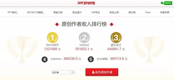 在PPT STORE模板网站上,就列举了原创PPT模板设计作者的收入排行榜,排名第一的Simon阿文在大学期间仅靠卖模板就盈利了132万元!