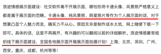 还有另一已经较为成熟的产业链是“PUA”。“PUA”为“Pick-up Artist”,原意为“搭讪艺术家”,如今在商业化中变了味。在“坏男孩学院”“浪迹学院”,可找到大量的恋爱教程。这些付费课程内容包括形象改造、展示面拍摄、搭讪技巧、心态建设等等。该平台组织学员进行线下的拍摄,名曰“展示面拍摄”,包括互拍、团队拍摄、单独私拍。