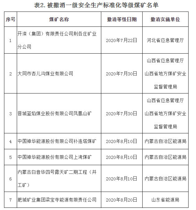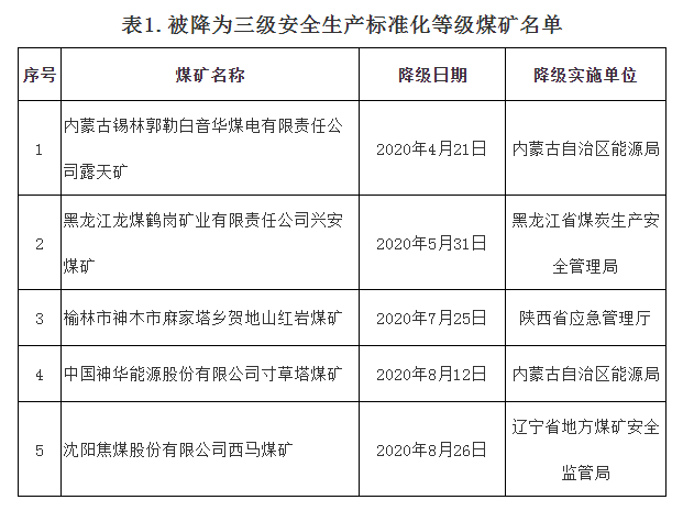 按照《煤矿安全生产标准化管理体系考核定级办法(试行)》(煤安监行管〔2020〕16号)有关规定,内蒙古锡林郭勒白音华煤电有限责任公司露天矿等5处煤矿一级安全生产标准化等级被降为三级,详见附表1。