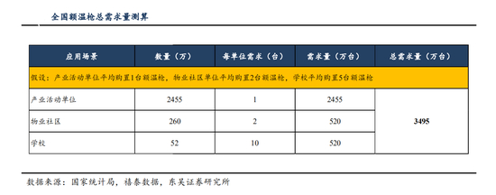 据东吴证券(10.520, 0.13, 1.25%)对额温枪在产业活动单位、物业社区和学校的需求空间进行的测算:以全国人口为13.93亿计,全国额温枪的人均保有量约为0.03台/人,假设全球额温枪的人均保有量为0.02台/人,以全球人口为75.94亿计,则全球额温枪市场的需求量约为1.52亿台,需求空间十分广阔。