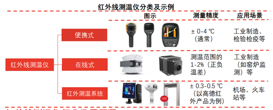 据头豹研究院整理,常见的红外线测温产品可以分为便携式、在线式以及红外测温系统三类。其中,便携式红外线测温仪应用场景广泛,在线式红外线测温仪主要应用于工业制造,红外测温系统主要应用于车站、机场、医院、大型工厂等人员密集场景的体温筛查。