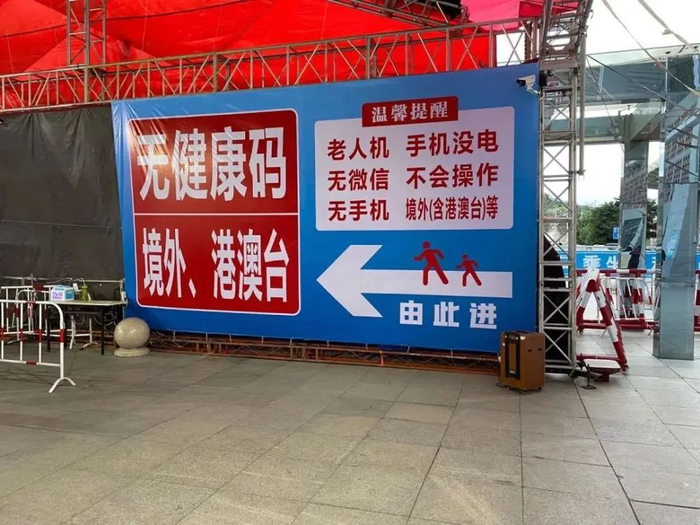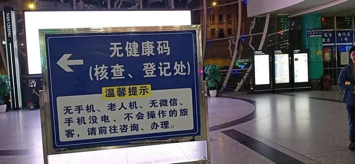 针对老人机、无微信及手机没电、不会操作、无健康码等特殊人群,南昌站和南昌西站在出站口设置相关专用通道,并附温馨提示。邹娴婧 摄