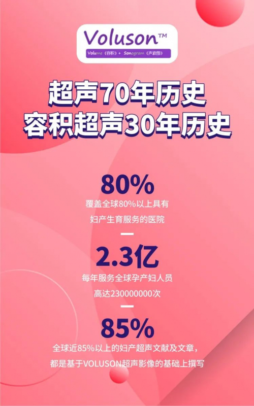 Voluson系列作为GE医疗专业妇产超声代表,已经成为了妇产领域的代名词,截止目前为止,VOLUSON系列妇产超声已经覆盖全球80%以上具有妇产生育服务的医院,每年服务全球孕产妇人员高达2.3亿次,除此之外,全球近85%以上的妇产超声文献及文章,都是基于VOLUSON超声影像的基础上撰写。