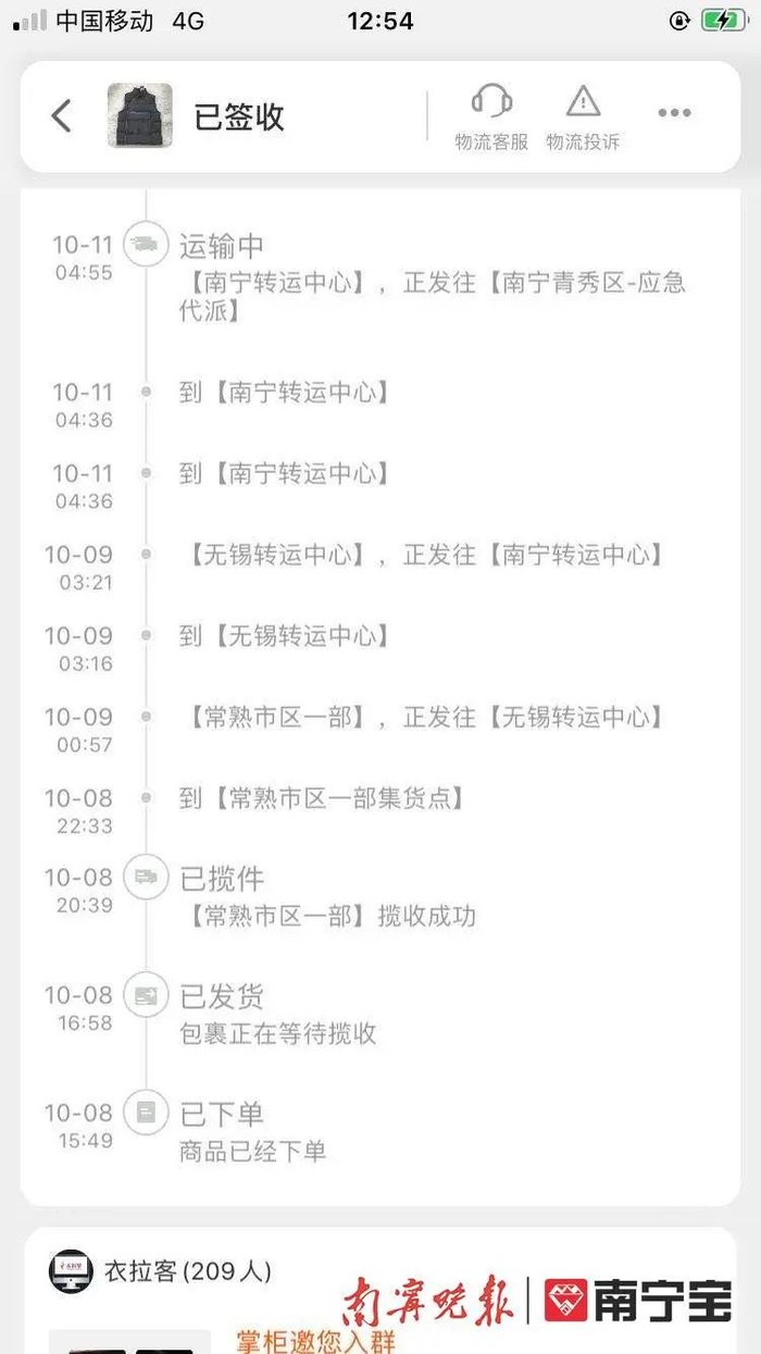 物流信息显示,乐先生的包裹11日已到达南宁,但直到20日仍未送货
