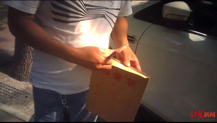 ▲与刘某某同样遭遇的邢某某等司机将2000元现金清点后,装进一档案袋中,随后 递给违章处理窗口工作人员。受访人供图
