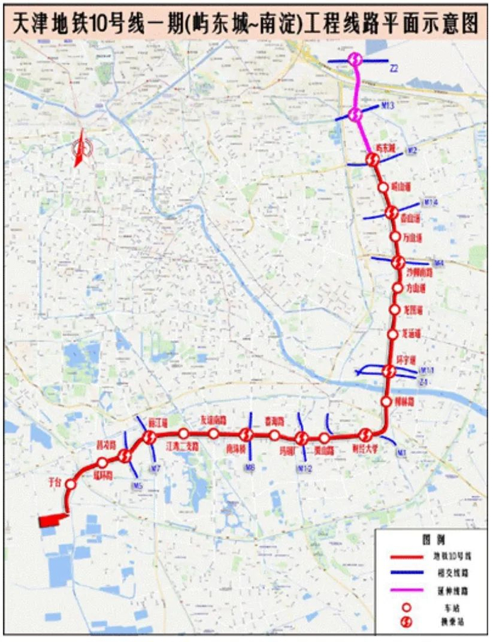 天津地铁10号线一期(屿东城站~南淀站)项目起自河东区太阳城,向北延伸止于东丽区南淀,途经太阳城、矽谷港湾、南淀三大片区,可与地铁13号线、市域Z2线实现换乘,建成后纳入地铁10号线一期贯通运营。