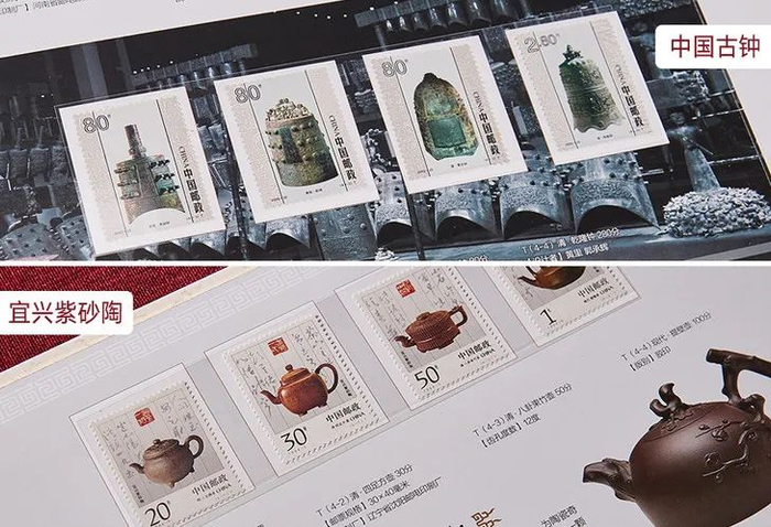 ▲中国古钟特种纪念邮票 宜共紫砂陶特种纪念邮票