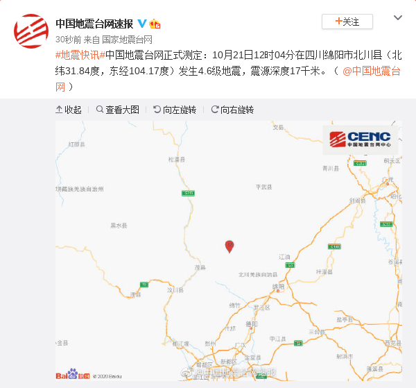 中国地震台网正式测定:10月21日12时04分在四川绵阳市北川县(北纬31.84度,东经104.17度)发生4.6级地震,震源深度17千米。( @中国地震台网 )