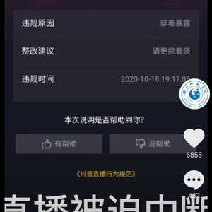 19日,该账号发布信息显示,当晚直播系被迫中断,由于“穿着暴露”违规被直播封禁3天,抖音平台还提出了“请更换着装”的整改建议。