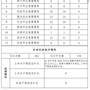 1至9月份,山西省共有179名矿长被记分,记分次数为205次。16名矿长在2020年记分周期内累积记分达到12分以上,被责任调离矿长岗位,3年内不得担任煤矿矿长。