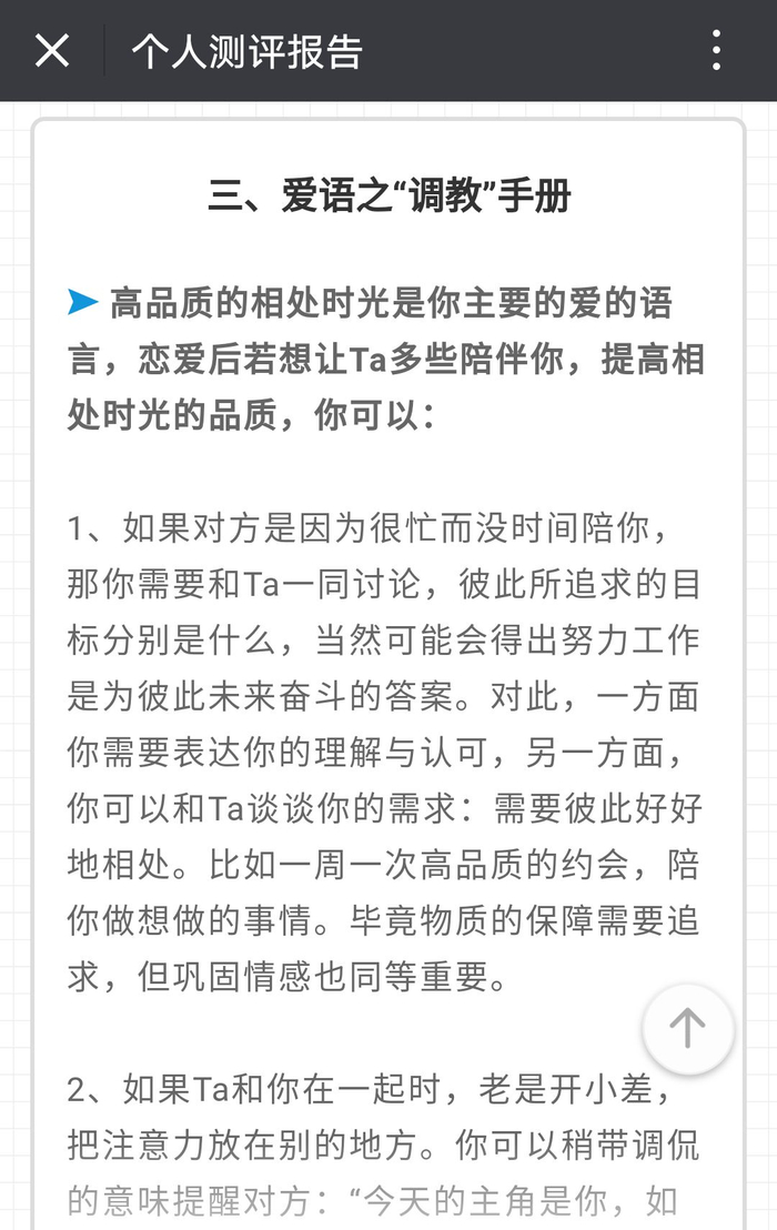 「恋爱语言测试」将分析你的「爱的语言」,并在报告中给予你建议,协助你让另一半读懂爱语,让Ta学会用对的方式来爱你。