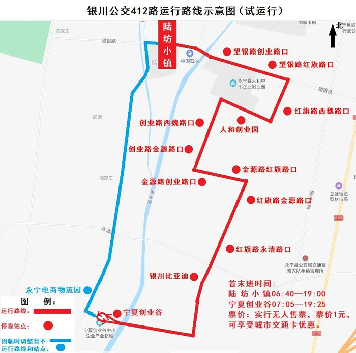陆坊小镇、望银路创业路口、望银路红旗路口、红旗路西魏路口、人和创业园、创业路西魏路口、创业路金源路口、金源路创业路口、金源路红旗路口、红旗路金源路口、红旗路永清路口、银川比亚迪、宁夏创业谷、永宁电商物流园(暂不停靠)