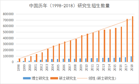 图2:中国历年(1998-2018)研究生招生数量(根据相关资料整理)