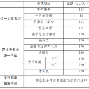 根据《关于上海市教育考试院有关考试收费等问题的复函》(沪价费〔2006〕005号、沪财预联〔2006〕1号)、《关于调整上海市教育考试院外语口语考试等收费标准的复函》(沪价费〔2003〕069号、沪财预〔2003〕第104号)文件规定,文化考试收费标准:报名费为每项考试25元/人(专科自主招生报名考试费另行通知),考试费为每项考试每科目26元/人;艺体类考试收费标准:报名费为每项考试20元/人,考试费为每项考试每科目50元/人。各类考试项目须缴纳费用如下表所示: