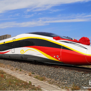 时速400公里跨国互联互通高速动车组外表面的白色主基调并配合中国红及黄色装饰线,凸显高贵与典雅,彰显民族自信。涂装图形样式提取自鲜花与如意的形态特征,波浪式的符号和动人心魄的凛然姿态,凝练出列车运动生命力,寓意着中国铁路生机勃勃勇往直前,吉祥如意再创辉煌。