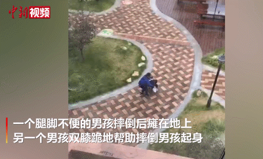 近日,山东日照莒县第一实验小学校园里,一个腿脚不便的男孩摔倒后瘫在地上,另一个男孩见状迅速双膝跪地,前者顺势趴在了他身上,随后缓缓站起,两人相互搀扶着慢慢走远。