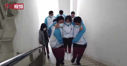 除了“好哥们儿”之间的互相帮助,还有这些善良的少年,一起帮助身体不方便的同学上下楼:
