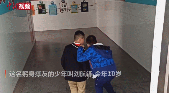 这是校园里常见的一幕。这名躬身撑友的少年叫刘航铄,今年10岁。他从一年级开始,就主动照顾腿脚不便的同学小超。