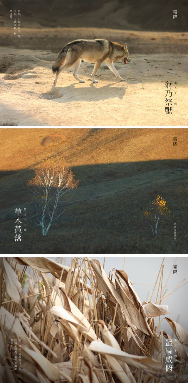 一候,豺祭兽丨豺狼的豺俗名“豺狗”,霜降日杀兽陈列,古人说是“祭秋金”,也是别秋的一种仪式。