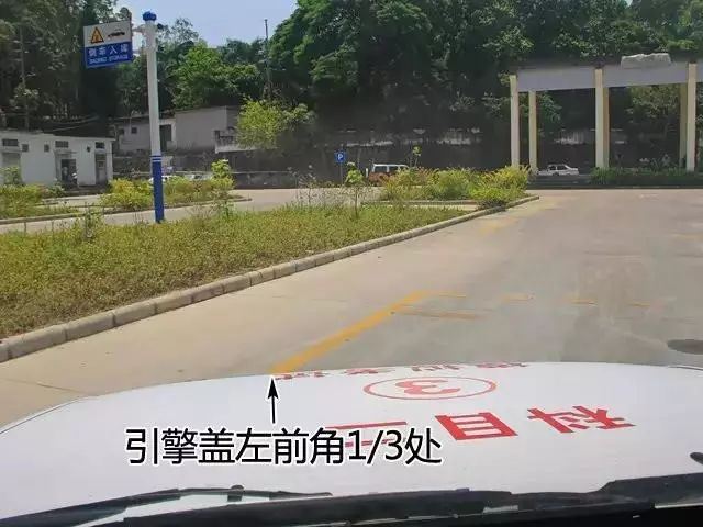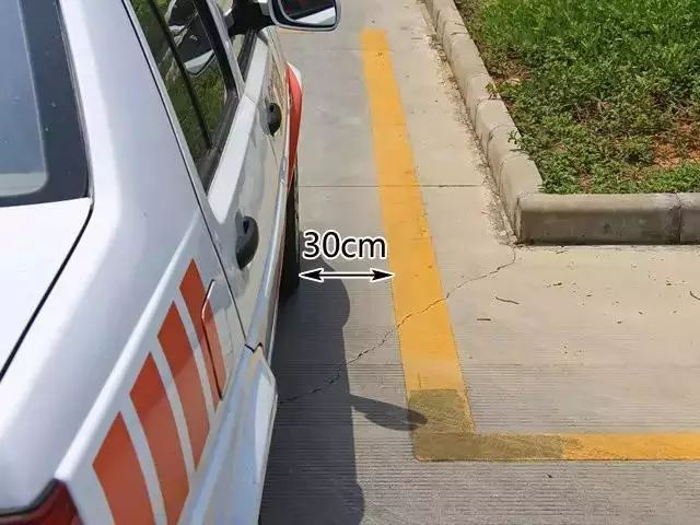 用引擎盖右前角1/3处追右侧路边线,目的是保证车身与右侧路边线约30cm的距离。(注:30-50cm的距离最佳)