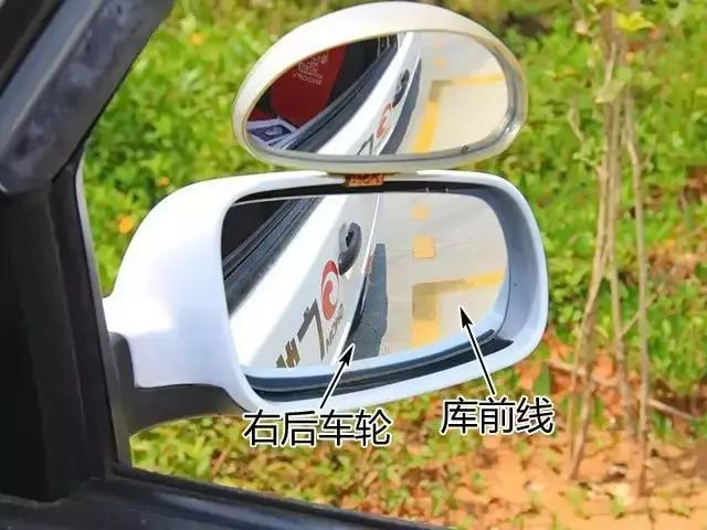 第四步:此时车身方向逐渐回正,后视镜中可以观察到车身与库边线平行,踩刹车停车。