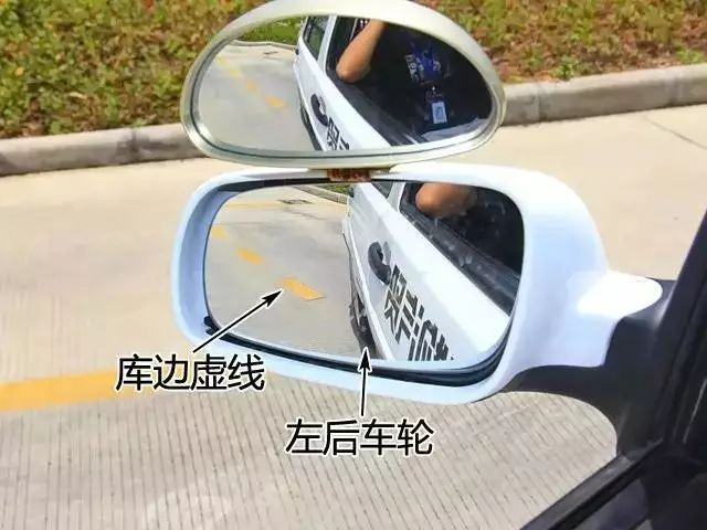 第三步:继续慢速倒车,观察左后视镜,当左后车轮压到库边虚线时,迅速往左打满方向。
