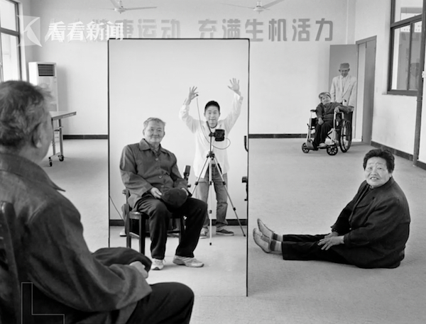 其实,给敬老院的老人拍照,颜小聪已经坚持了很多年,原本就是摄影专业的他,还特意创作了这组,通过镜子反射,将自己与老人一同摄入画面的摄影作品,就是想通过这种幽默、新奇的手法,来让大家了解敬老院老人的晚年生活。
