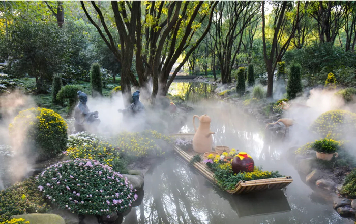 今天上午,海岸君探访开幕前的菊展。在优美的水系中,菊花有了最好的“舞台”——河岸边、水面上,一簇簇一丛丛菊花摇曳生姿,载满菊花的木船横斜,与镜面般的湖面共同营造出浪漫的森林美景。叠水区的自然式菊花小径,则彰显了“菊在林下”的野趣。