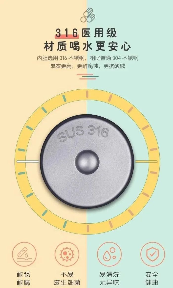 316是一种得到广泛应用的钢种,316中添加钼元素使保温杯获得了耐酸碱、耐高温的能力。